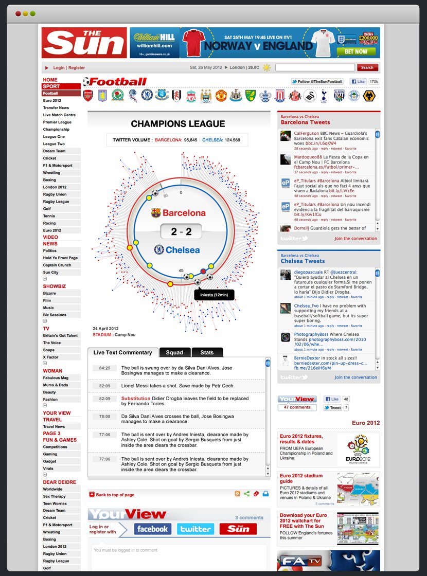 Using The Sun branding and colour schemes I created a timing diagram with two different keylines representing the teams, and relevant highlights of the match marked by the symbols, and the potential to replay the highlight or read the feeds.